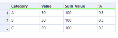 A very simple doubt. I need to take out the share category wise. So I need to take out total of values (100) and divide a particular category's total/ by the sum total so 50/100 in category A. Kindly help.