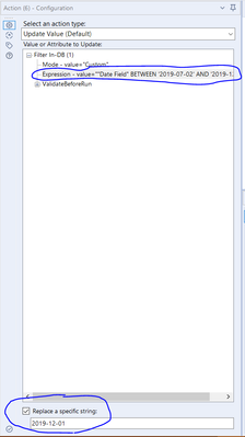 Once you've got your SQL filter condition in the in-DB filter tool you'll need to define how the date interface tools interact with the filter condition. This happens through the use of the action tools. If you look into the configuration of each action tool you'll need to make sure it's updating one of the dates in the filter condition. One action tool to update each date in the condition. Ensure the circled part in the screenshot below is highlighted (which tells the action tool which part of your filter tool you'll be affecting - in this case the formula) and use the "Replace a specific string" section at the bottom of the configuration pane.