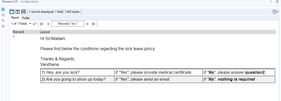 I am still new to Alteryx and I am trying to create a mail merger using the email tool. I am able to achieve the mail merge but I want to insert a table into the mail body. I want to modify the text font to Italic and bold only a few words. I have attached the screenshot of how the table should look like. Please help me with this.