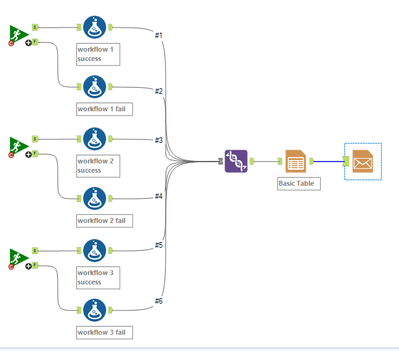 So you could use one workflow with 10 runners for your workflows, add a formula tool to the runner outputs which would add a column saying which workflow that is and if it failed to send (coming from the failure output) or sent correctly (success output) - union everything together, put it in a table, and send via email to you
