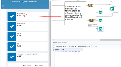 Also, assuming I use the same features, same type of model (Logistic Regression), same dataset, why would the assisted modeling tool result in a different accuracy then the manually configured predictive tools? I was using the neural network sample dataset and some of the insights about features from the assisted modeling tool for selecting features, but accuracy is different.. Assisted modeling results in a 68% accuracy, while the logistic regression tool results in a 71%. Why would I use assisted model if the predictive model results in a higher accuracy? The features assistive modeling recommended I deselect reduced model accuracy.