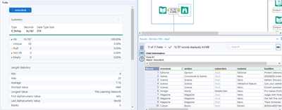 Exactly what you're going to see will depend on the version of Alteryx you're running. You can click on any field in the results pane to see the profile information for that field. For me it looks like this: